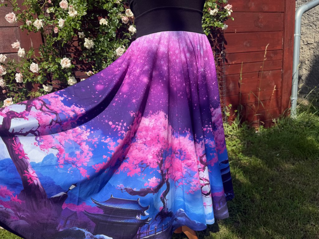 - střih - kolová sukně s délkou 82cm u vel. S+M, 80cm u velikosti L+XL po kotníky