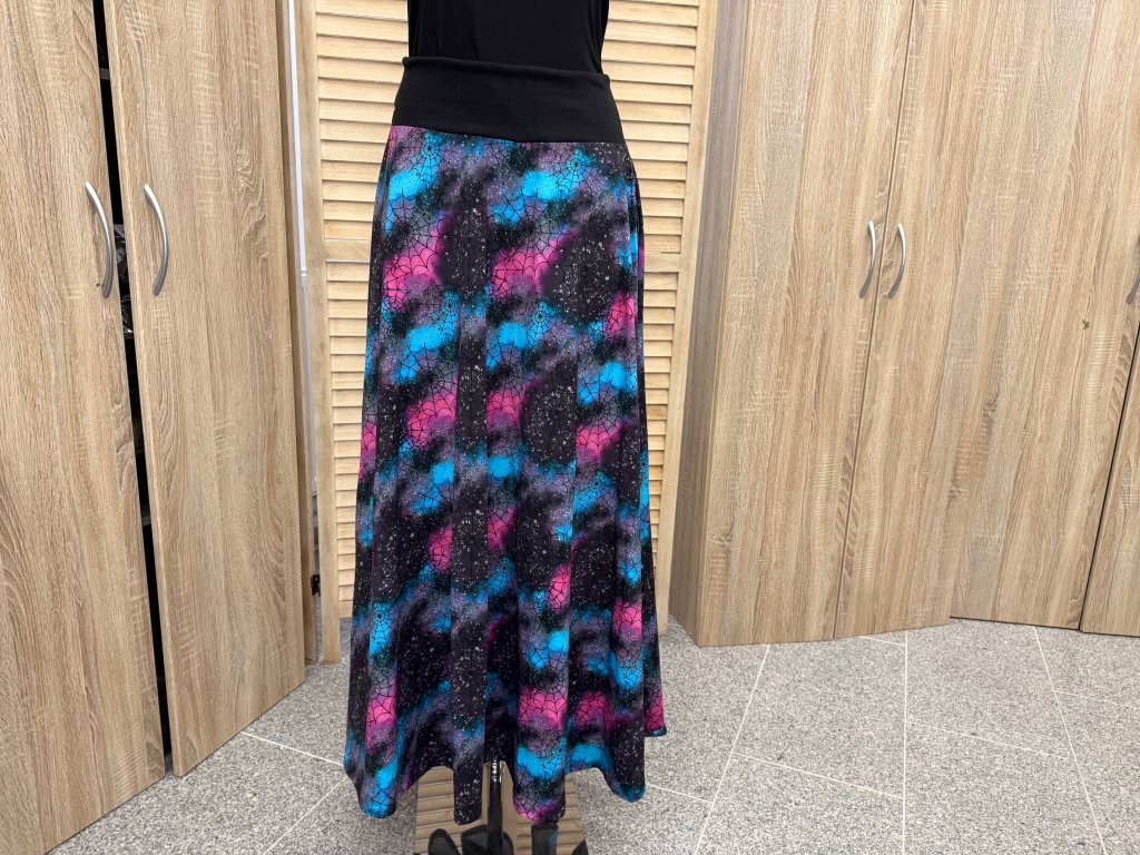 Originální půlkolová sukně, která zaujme na první pohled svým netradičním designem. Barevná kombinace růžové, tyrkysové a černé vytváří efekt tajemného vesmíru, v němž se prolínají jemné linie připomínající pavoučí síť.