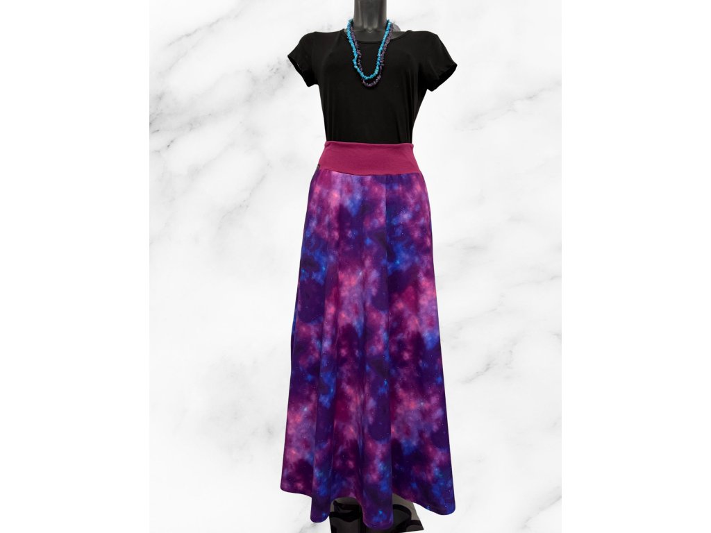 Dámská dlouhá na zem půlkolová úpletová sukně bez kapes, modrofialová mračna, vel S,M