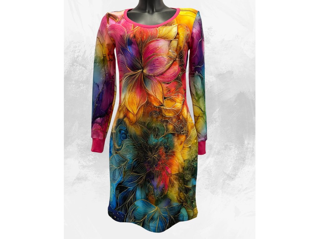 Originální šaty z teplákoviny, s dlouhým rukávem, ve kterých vyniknete. Barevné květinové mandaly.
