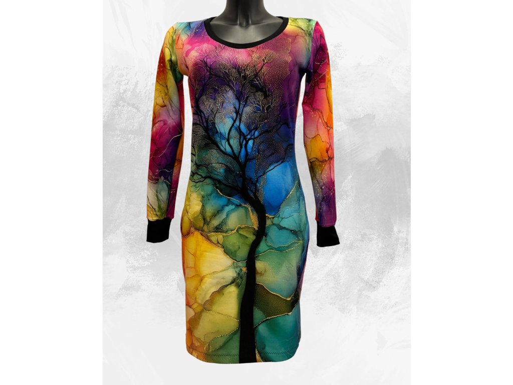 Originální šaty z teplákoviny, s dlouhým rukávem, ve kterých vyniknete. Jedinečný strom na barevném duhovém pozadí.