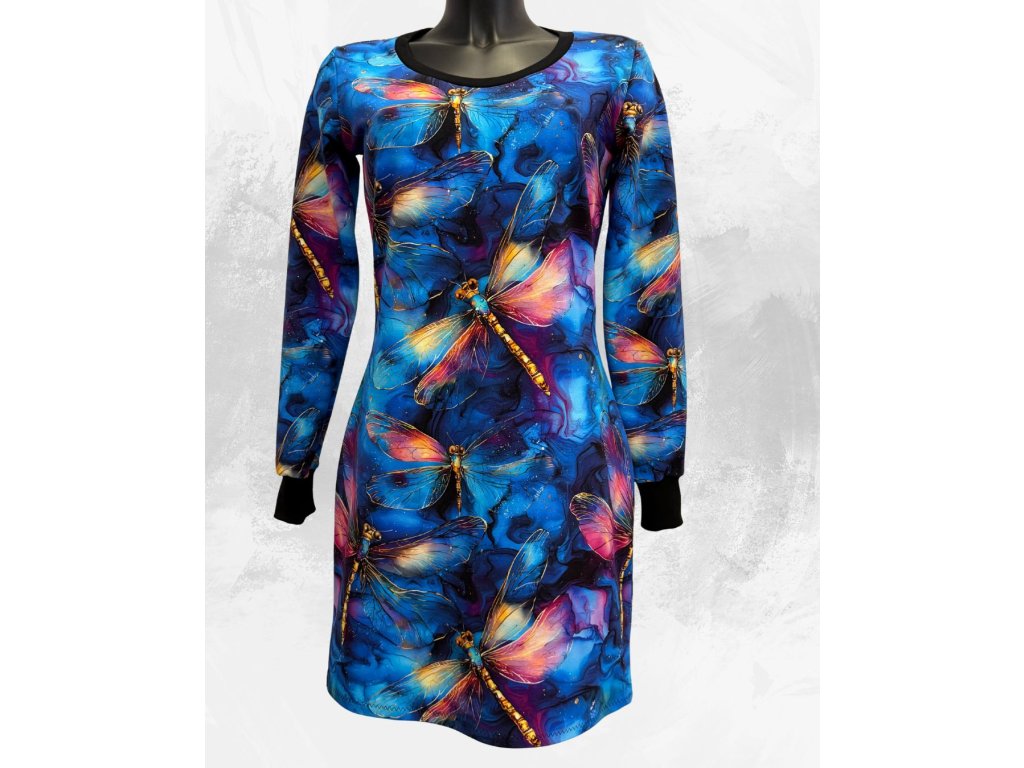 Originální šaty z teplákoviny, s dlouhým rukávem, ve kterých vyniknete. Úžasný motiv barevných vážek